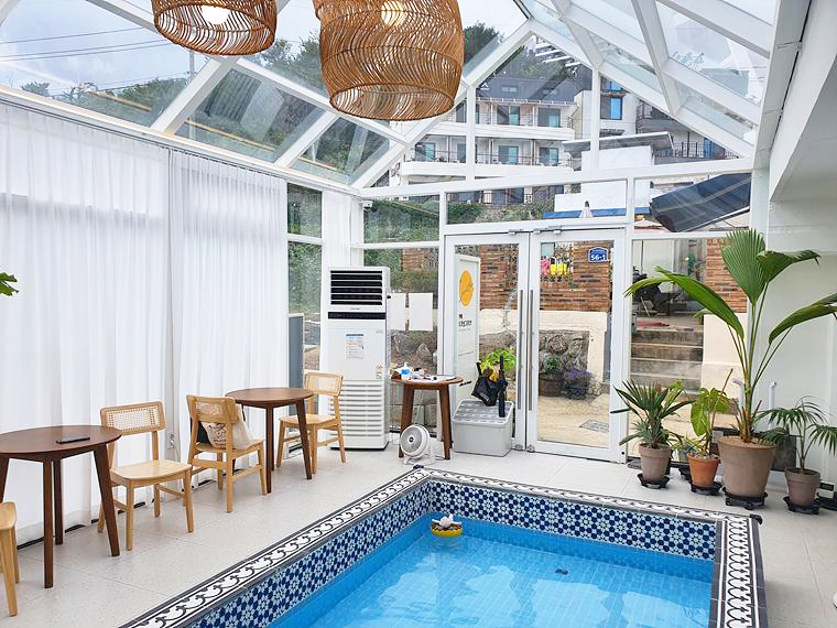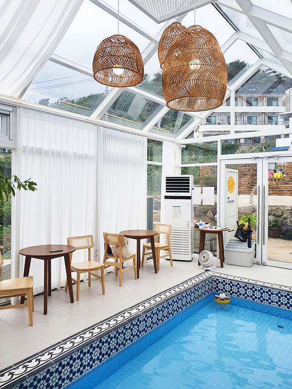 실내에서도 큰 창을 통해 수영장이 있는 온실쪽을 볼 수 있었답니다.