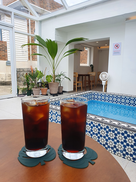 커피 한잔 하며 파란 물과 초록 식물들을 보고 있자니 눈이 정화되는 기분..!