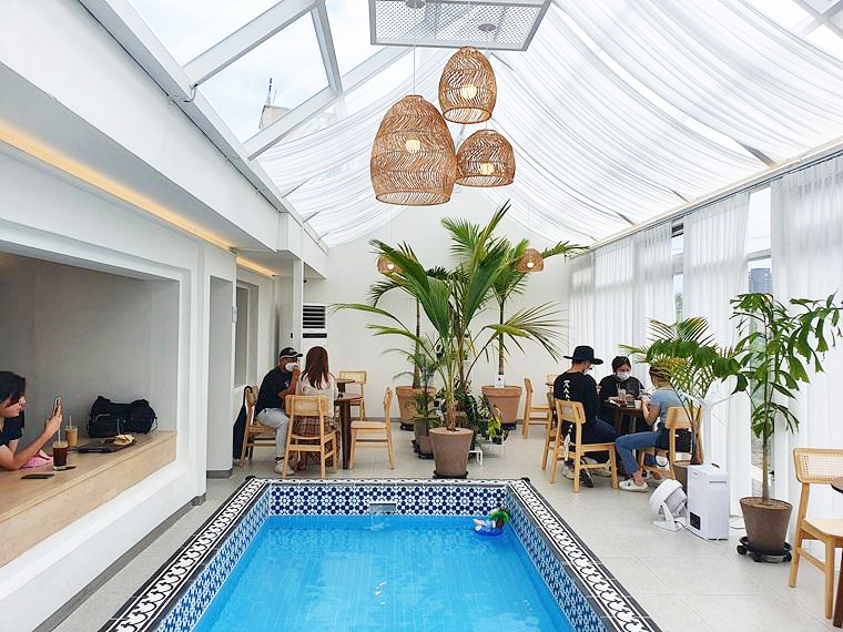 파란 수영장과 라탄 조명, 테이블들, 야자수의 조화가 참 예뻤어요.
