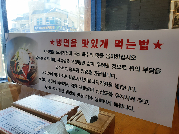 테이블마다 붙어있는 냉면 맛있게 먹는 법을 열심히 숙지? 하다 보니 테이블 세팅이 시작되었습니다.