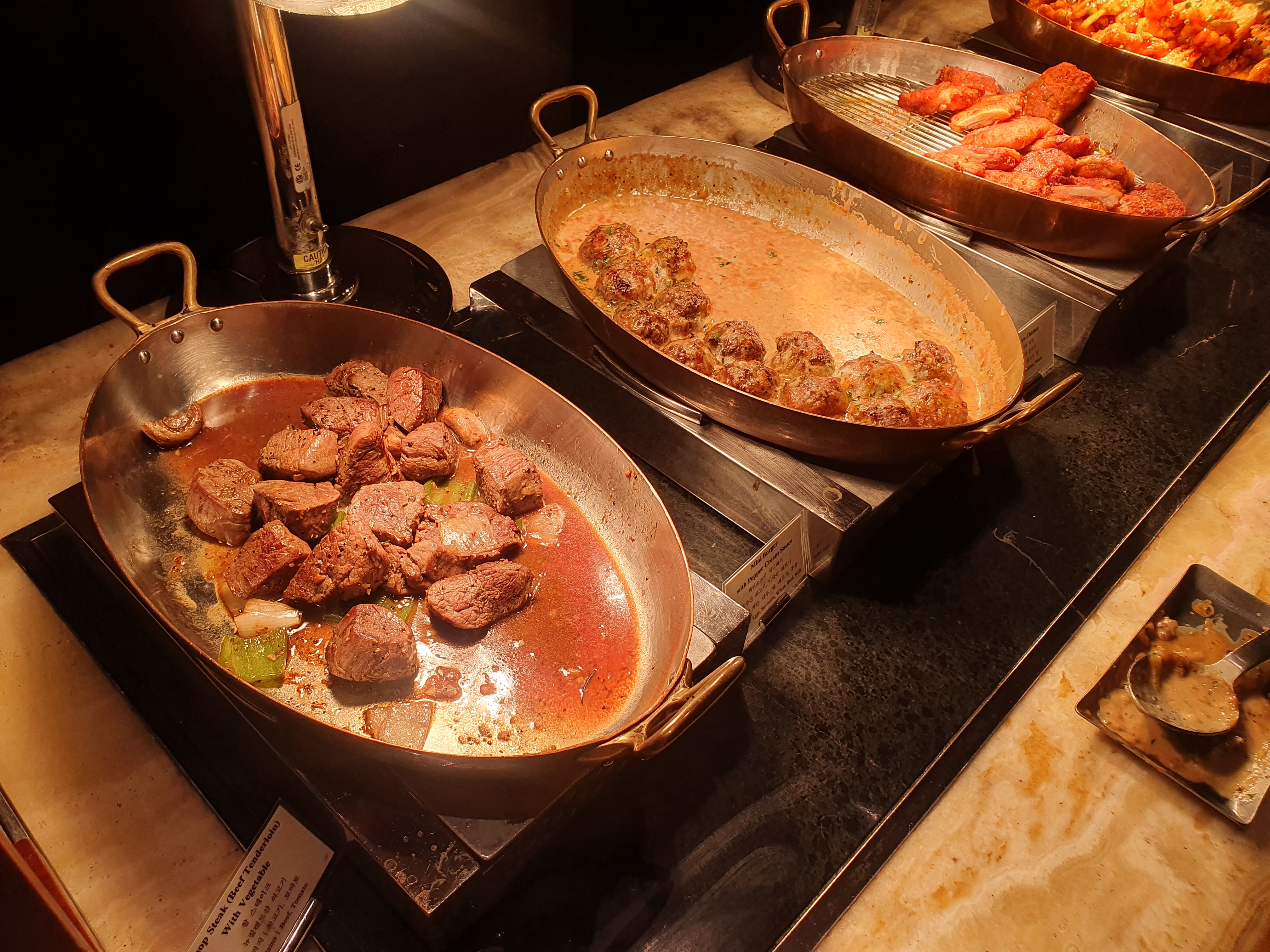 소고기 찹스테이크, 미트볼, 타코 치킨, 게 튀김,