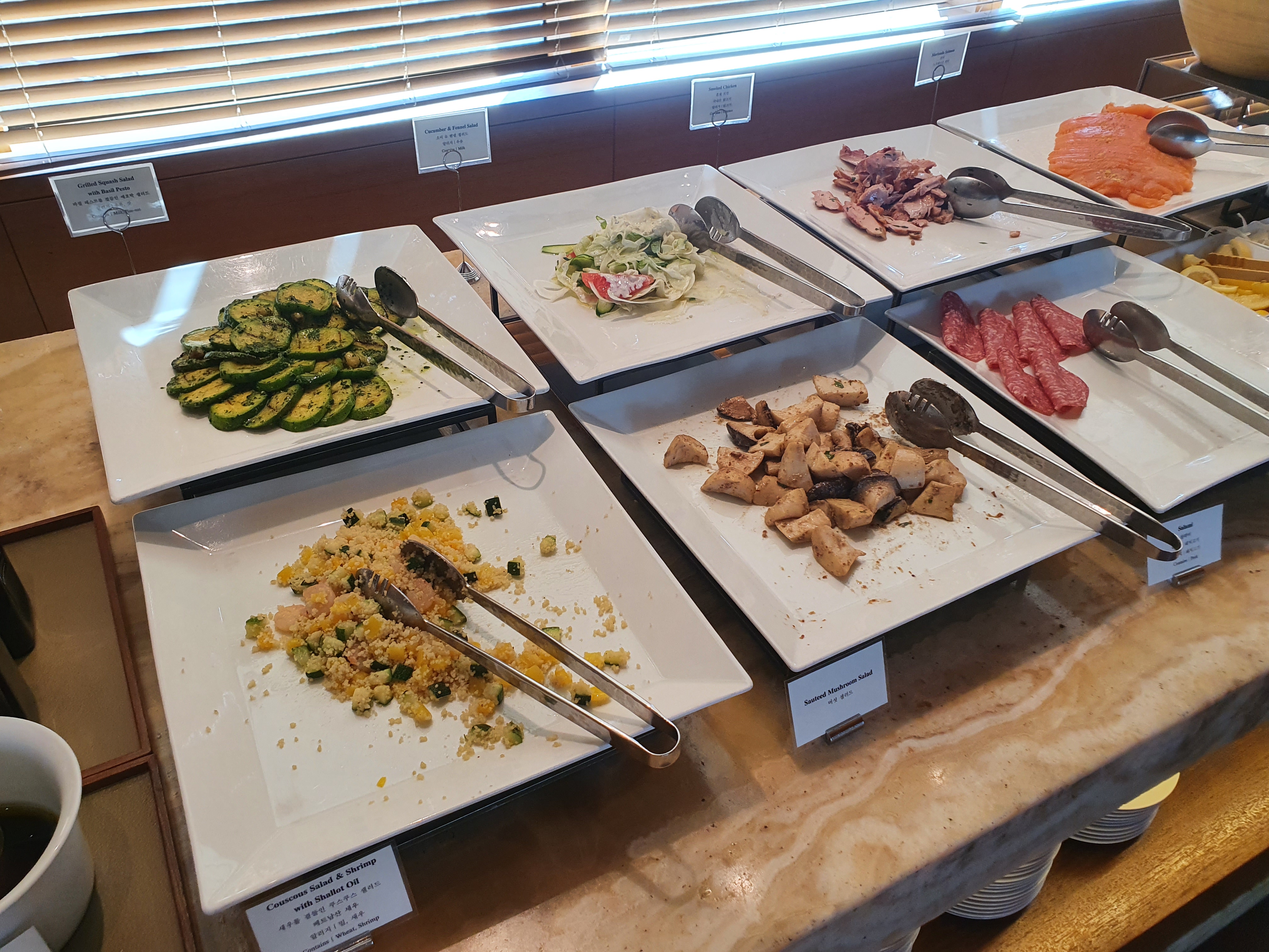 샐러드류와 훈제치킨, 훈제연어, 새우 쿠스쿠스 샐러드, 버섯 샐러드, 살라미, 치즈, 견과류, 백김치