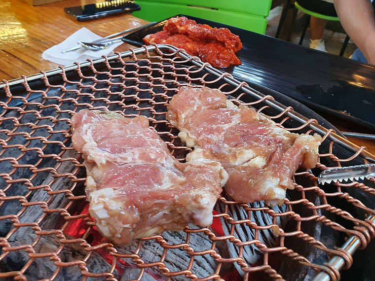 지글지글 맛있는 소리와 숯불향을 내뿜으며 닭갈비가 익어갑니다. 닭껍질 때문에 금방 탈 수 있어 계속 들었다 놨다 하며 구워줘야 해요.