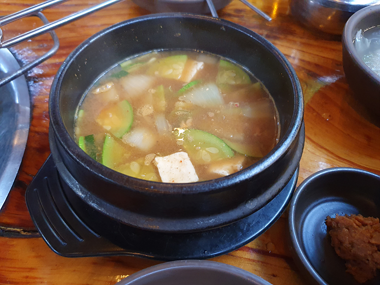 된장찌개는 우렁이 들어간 찌개인데 특별하지는 않았어요. 공깃밥도 함께 나옵니다.