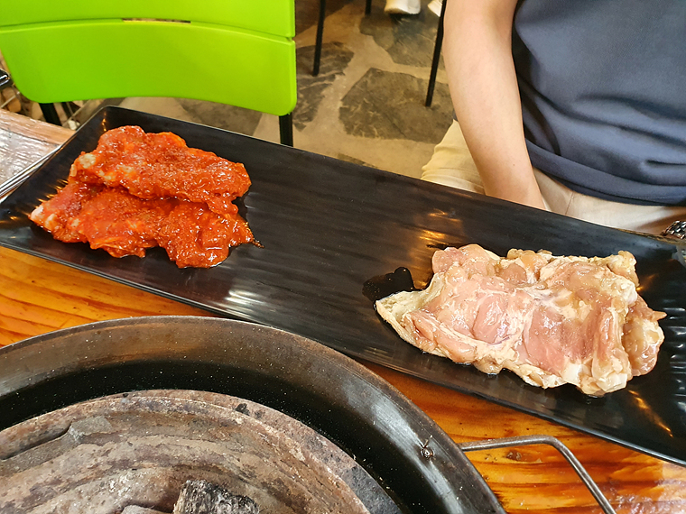 음식은 금방 준비됐어요. 양념이 덜 강한 간장 닭갈비 > 고추장 닭갈비 순으로 구워봅니다.