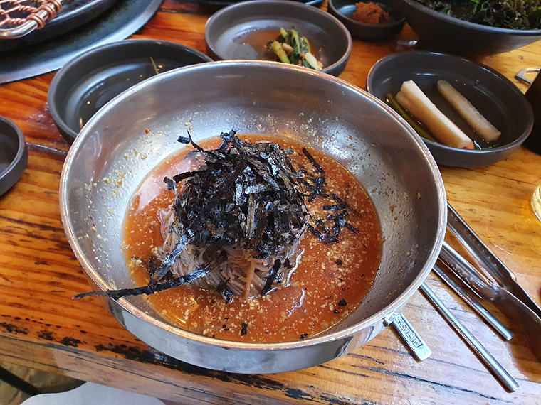 막국수는 새콤 달콤하고 자극적인 맛이었어요. 크게 기대하지 않았던 터라 고기랑 같이 먹기 나쁘지 않은 정도였습니다. 막국수 전문점 같은 맛을 기대하기는 어렵고요.