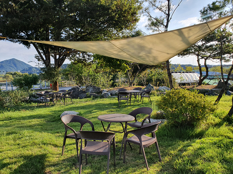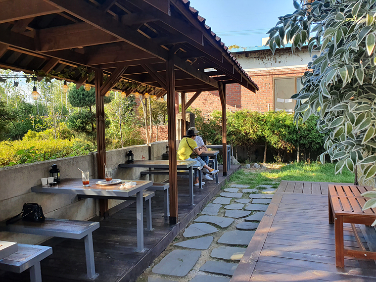 앞서 보여드린 자리 외에도 좌석수가 꽤 많았요. 이렇게 건물 외부에 잔디밭에도 자리가 있고, 데크 자리도 있어 여유롭게 이용이 가능한 카페입니다.