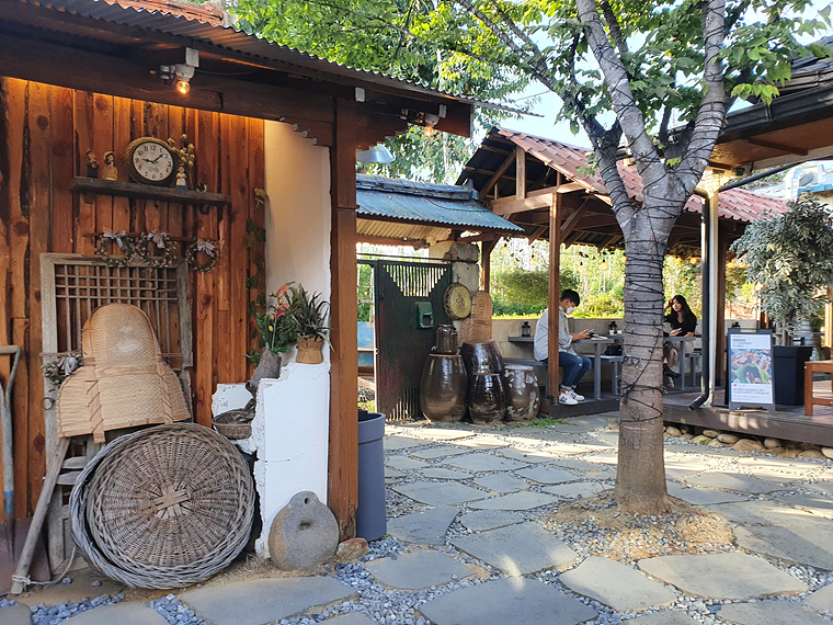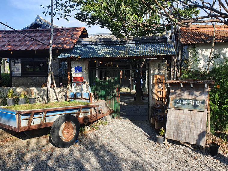 입구부터 마치 시골 할머니 집에 온듯한 감성이 가득 느껴지는 신북 커피입니다. 농기구, 장독대, 칠이 벗겨진 대문까지 하나같이 정겨운 모습이에요.