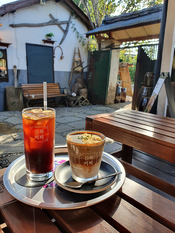 춘천에서 액티비티를 마치고 커피를 마시러 간 신북 커피는 춘천에서 가장 좋았던 카페예요. 오래된 한옥을 개조한 카페로 입구부터 시골 할머니 댁에 놀러온 듯, 레트로 감성이 한가득 느껴지는 곳입니다.