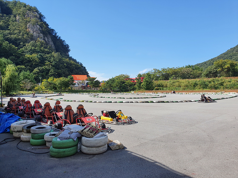 레일바이크를 타고 중간 쉼터에 도착하면 '낭만열차'로 갈아타고 강촌역까지 이동합니다. 강촌역에서 무료 셔틀버스를 타고 김유정역에 돌아갈 수 있지만 저희는 카트를 타러 강촌 테마랜드로 향했어요. 강촌 테마랜드는 낭만열차를 타고 내리자마자 바로 보여서 쉽게 찾아갈 수 있었어요.