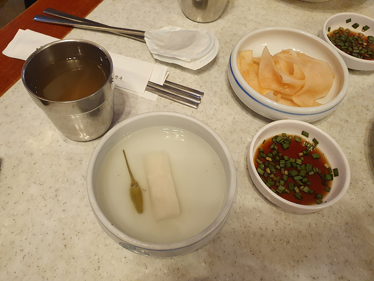 함께 내어주시는 따뜻한 육수에서는 진한 육향이 나면서 끝에 생강 맛이 올라옵니다.