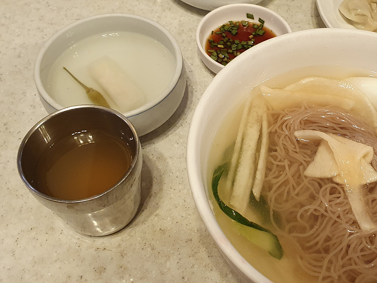 바로 직전에 우래옥을 다녀와 비주얼부터우래옥의 냉면과 비교가 되었어요. 우래옥보다는 조금 더 소박한 비주얼입니다. 면 위에 절인 오이, 무, 배, 계란이 고명으로 올라가 있었어요.