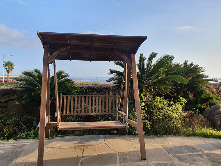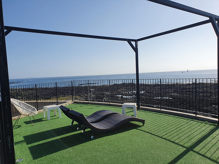 루프탑으로 올라오니 제주 바다가 시원하게 보입니다. 주변에 건물이 없어서 탁 트인 바다를 볼 수 있어요.