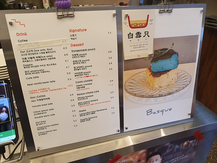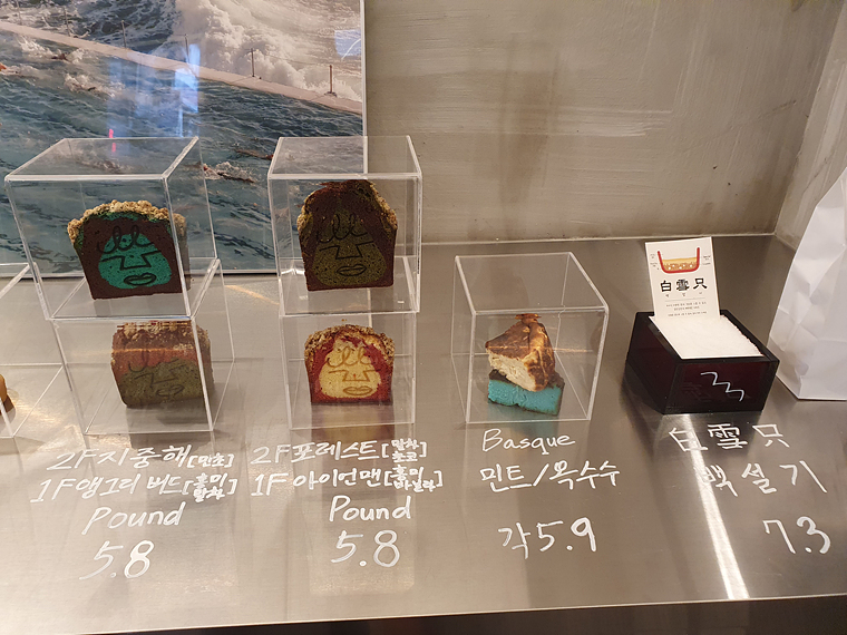 얼굴 모양이 그려진 파운드케이크와 바스크 치즈케이크, 백설기 빙수가 유명하다고 하네요.
