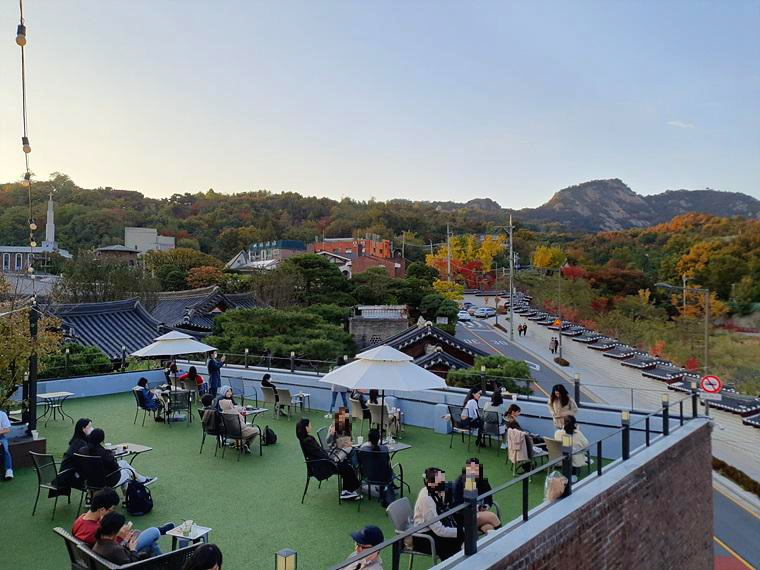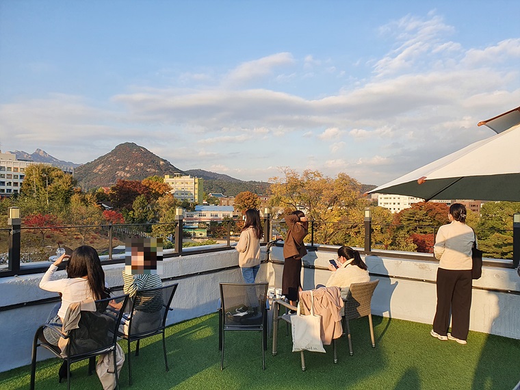 서촌 루프탑 카페 아르크, 인왕산과 북악산에 이르는 산 뷰부터 운경고택의 고즈넉한 한옥 뷰까지 탁 트인 뷰를 느끼며 힐링하기 좋은 카페입니다. 요즘처럼 울긋불긋 단풍이 드는 시기에 가면 다채로운 자연의 색상을 마음껏 느낄 수 있어요. 제 기준, 서울에서 가장 아름다운 뷰를 지닌 카페라고 얘기하고 싶습니다.