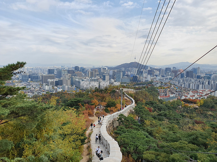 한참 오르다 뒤를 돌아보니 성곽과 저 멀리 남산타워가 함께 보이네요.
