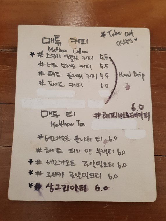 매튜박의 메뉴는 핸드드립 커피와 밀크티, 샹그리아티가 준비돼 있어요. 메뉴에는 없었지만 스콘도 있다고 하여 주문해 봤습니다.