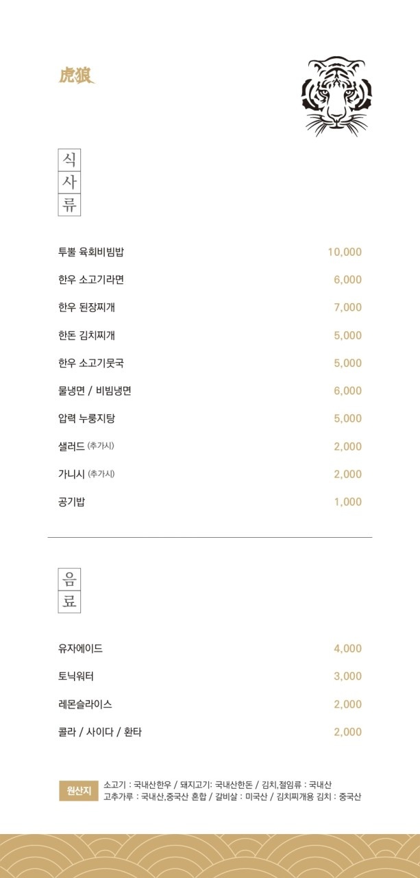 실내는 대리석 테이블에 조명 하나하나가 멋스러워 고급스럽고 차분한 분위기에요. 이름에 호랑이가 들어가는 만큼 중간중간 호랑이 인테리어도 빼놓지 않았더라고요.