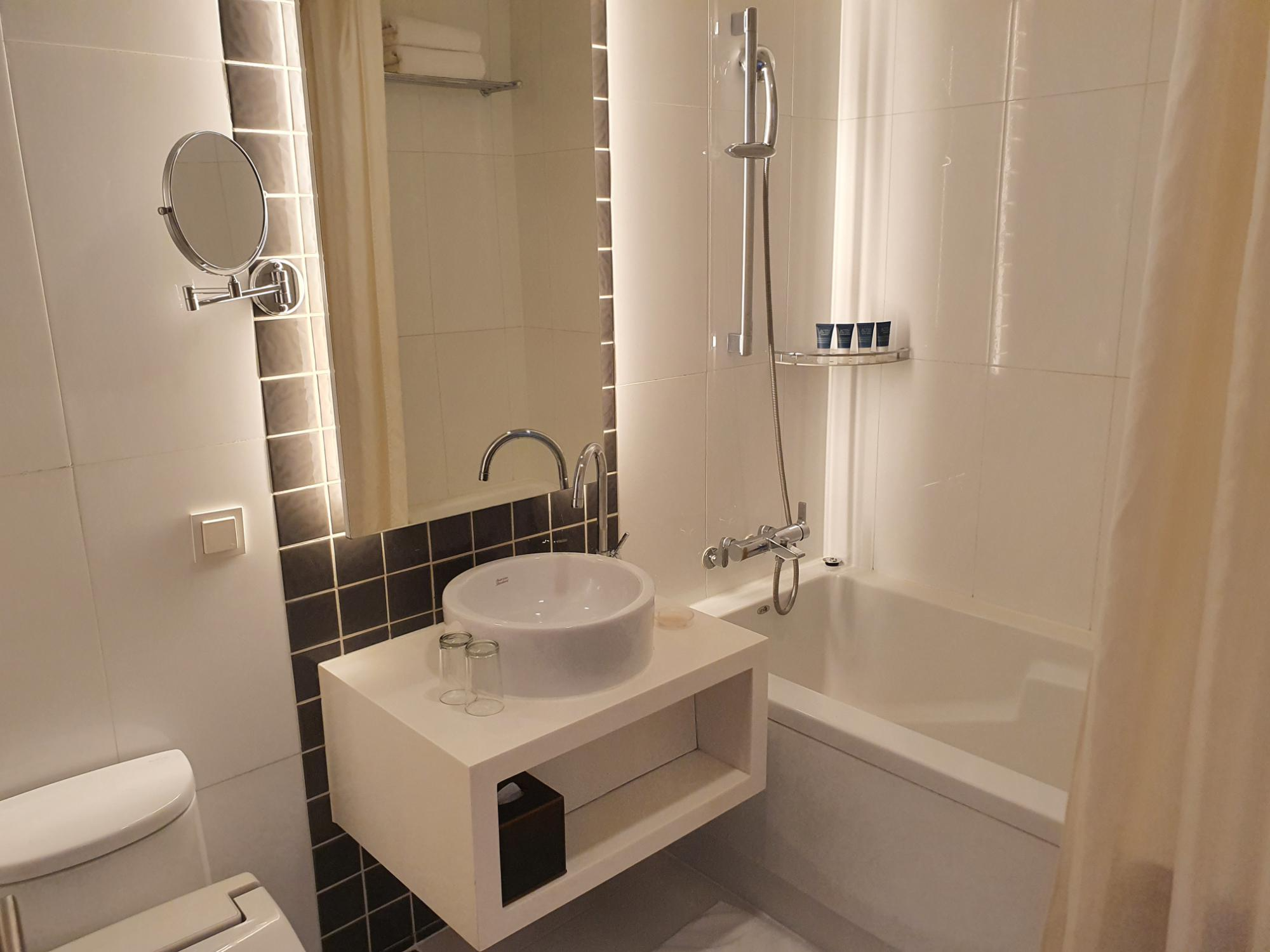 화장실은 깔끔합니다. 다만 세면대가 낮고 좁아서 사용하다 물이 사방으로 튀기 쉽습니다. 하지만 기대하지 않았던 욕조를 만났기에 이 정도쯤은 괜찮습니다.