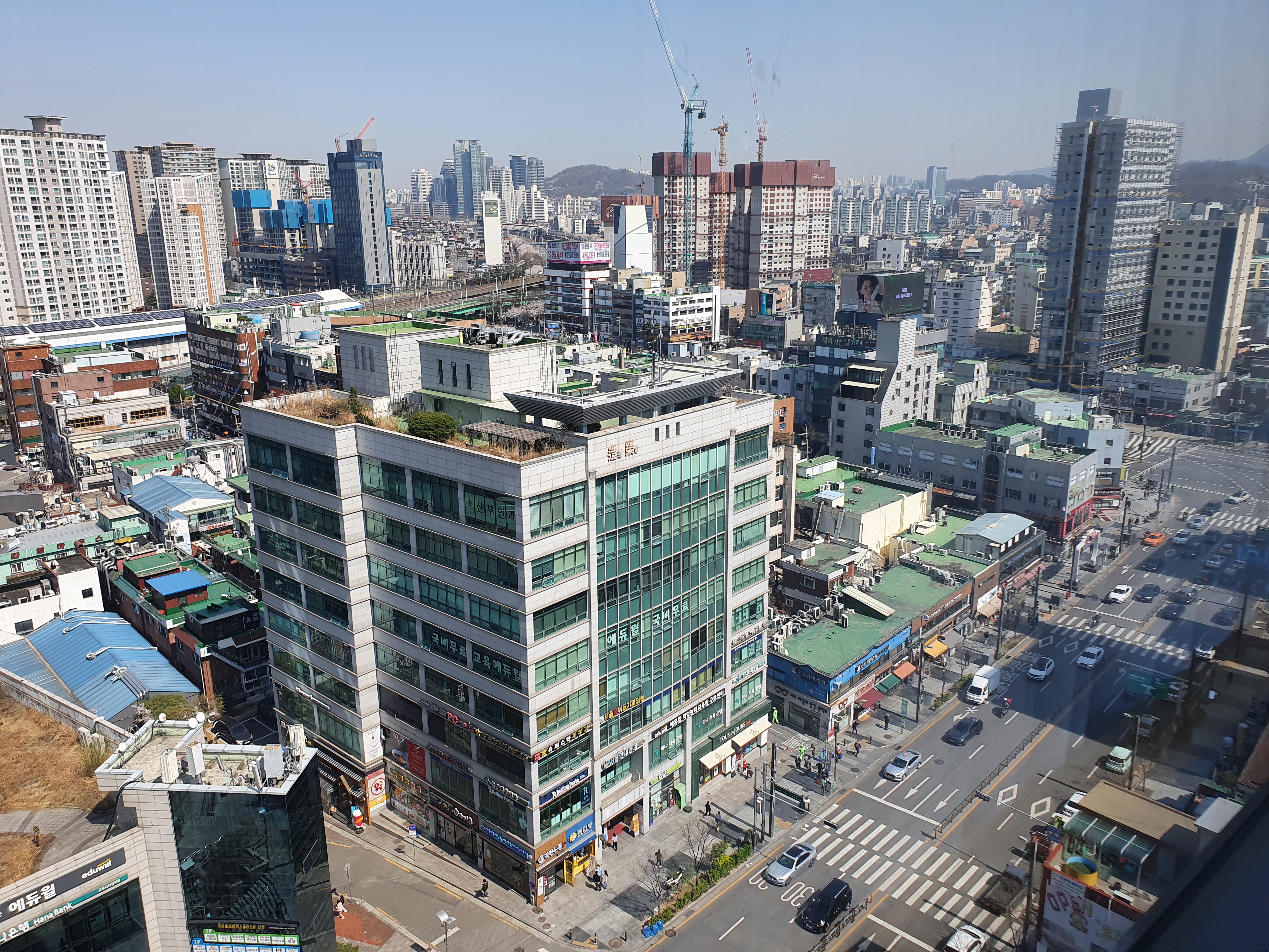 커튼을 걷어보니 구로 디지털 단지역 주변이 내려다 보이네요.