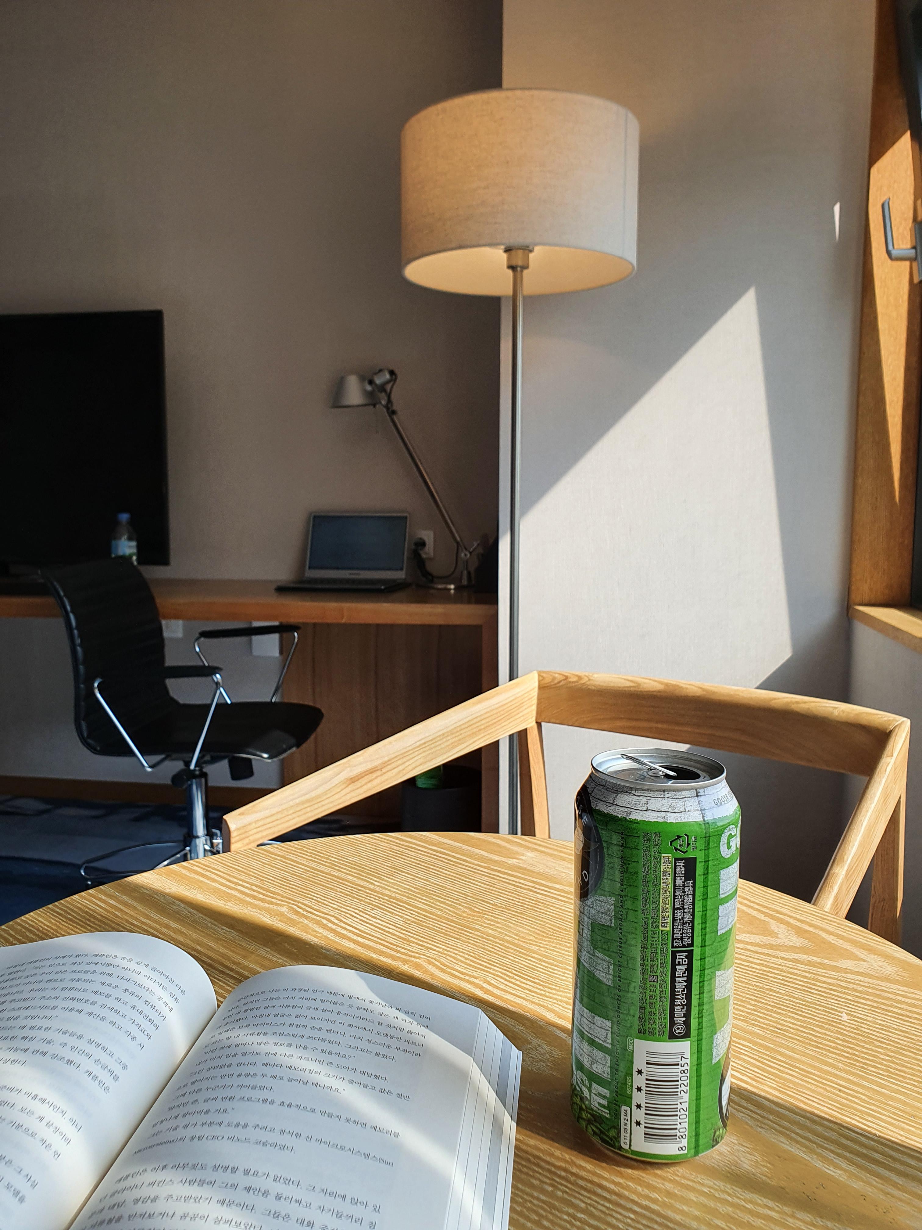 창가 테이블에 앉아 책 읽으며 맥주도 마시고