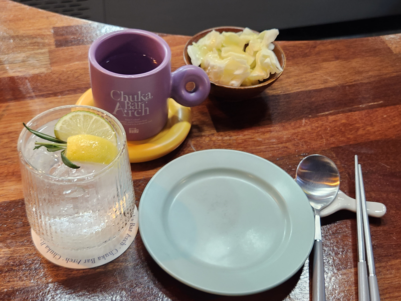 먼저 드라이 하이볼이 나왔습니다. 평소에 고량주를 썩 즐기지는 않는데 이 하이볼 정말 맛있더라고요! 하이볼에 올라간 로즈마리가 향긋하면서 파인애플 향이 느껴져서 상큼하고 맛있었어요. 보라색을 중심으로 컬러를 맞춘 식기들도 예뻤습니다. 기본 안주는 상큼한 소스가 올라간 양배추가 나와요.