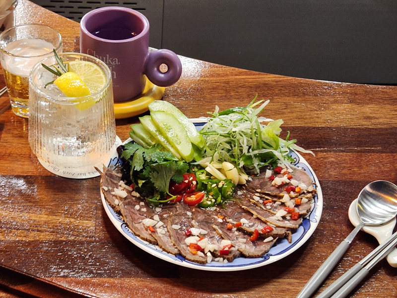아롱사태 장육이 먼저 나왔습니다. 아롱사태에 파채, 고수, 오이, 마늘과 고추, 삭힌 계란이 함께 나오고 고기에 모든 재료를 함께 싸 먹으면 됩니다. 굉장히 특별하다! 는 아니었고 신선한 재료로 만들어 무난하게 맛있는 요리였어요.