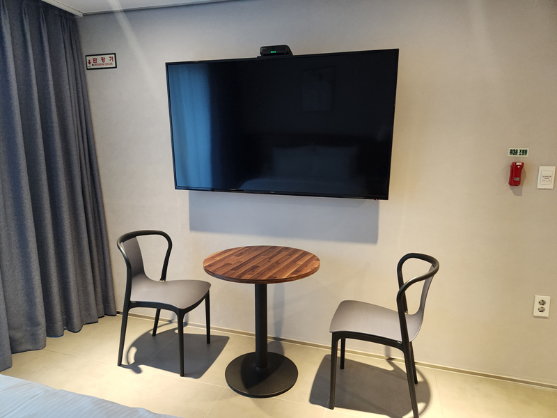 침구 앞으로는 TV와 테이블이 있어요. TV도 사이즈가 꽤 커서 만족스러웠습니다.