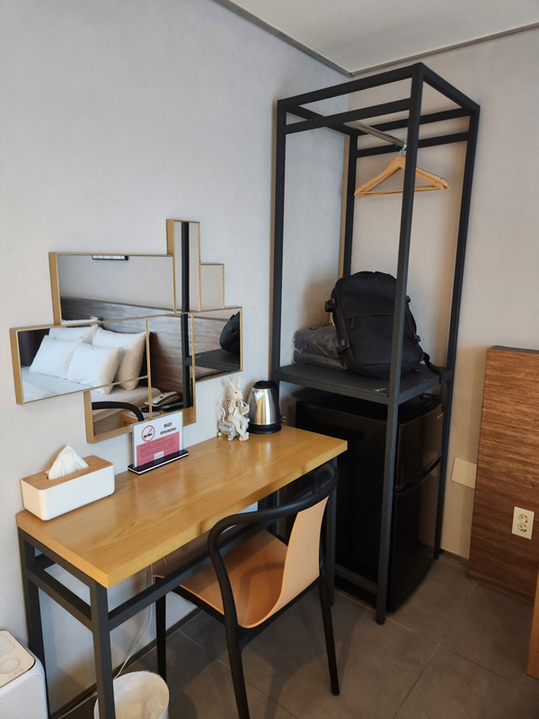 침대 옆으로는 테이블과 거울, 옷걸이가 있습니다. 옷장은 없지만 가성비가 좋아 이해할 수 있었어요. 옷걸이 쪽에 가운과 어매니티가 준비되어 있는데 칫솔, 치약, 클렌징폼, 로션 등 부족한 것 없이 잘 준비되어 있었어요.