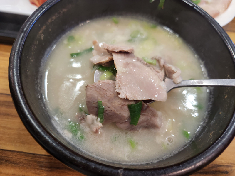 백반의 나오는 수육 고기는 부드럽고 맛있었지만 국밥에 비해서는 평범한 느낌이었어요. 시간이 지나니 점점 말라가기도 하고, 오히려 국밥 안에 들어있는 고기가 더 부드럽고 맛있었습니다. 수육백반은 국물, 고기, 밥 양이 모두 적고 수육은 평범해서 일반 국밥으로 2개 시킬걸 후회했어요. 하지만 국밥 자체는 정말 맛있었습니다.
