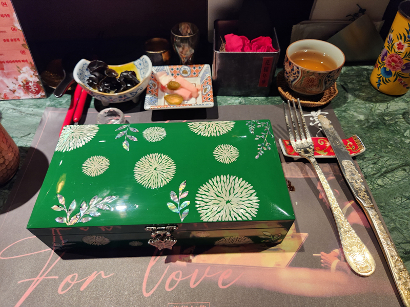 자리로 안내를 받았습니다. 화양연화의 테마를 잘 보여주는 화려하면서도 봉환적인 플레이팅이 예뻤어요. 화려한 꽃 접시는 화양연화 테마에 맞게 직접 제작한 것이라고 하네요. 접시 위에 2046 키링은 영화 속 두 주인공의 작업실 방번호 이기도 합니다.