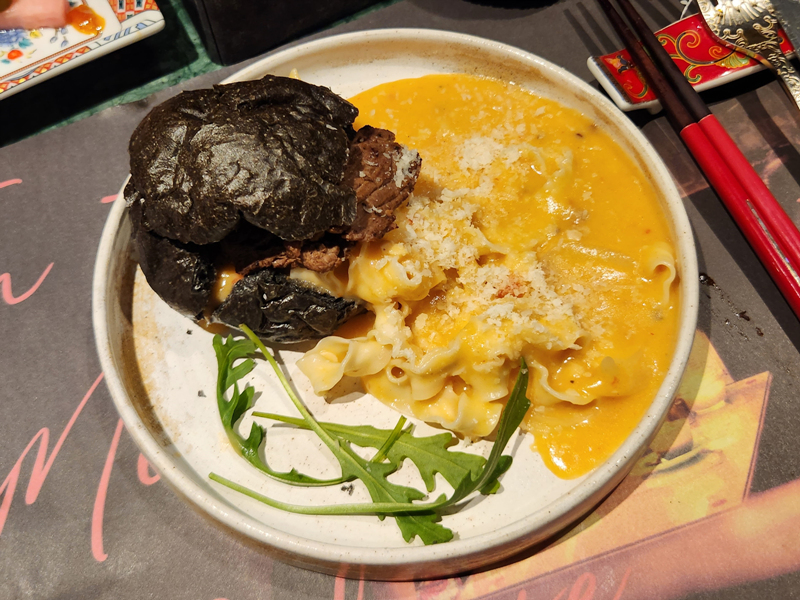 뚜껑을 열어보면 알록달록한 색감의 뇨끼가 살포시 놓여있습니다. 보기에도 예쁘지만 색깔별로 맛이 달라서 먹는 재미도 있었어요. 뇨끼 접시 아래에는 치파오가 연상되는 천이 깔려 있는데요, 이런 작은 디테일이 곳곳에 숨어있어 몽중식에서의 시간이 더 기억에 남는 것 같네요.