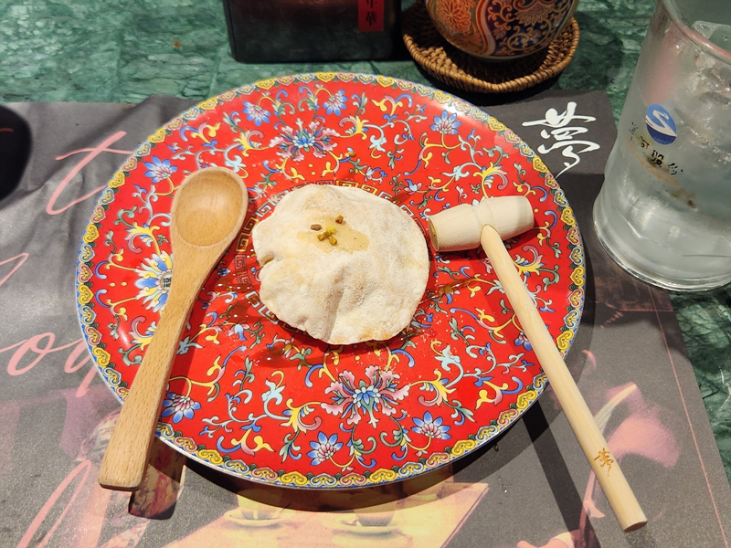 다음으로 화려한 비주얼의 딤섬이 나왔습니다. 그릇부터 식용 꽃 장식까지 너무 예쁘죠?독특하게도 속은 닭죽으로 채워져 있는데요, 아픈 양조위를 위해 장만옥이 손수 끓였던 죽이 생각나는 메뉴였어요.