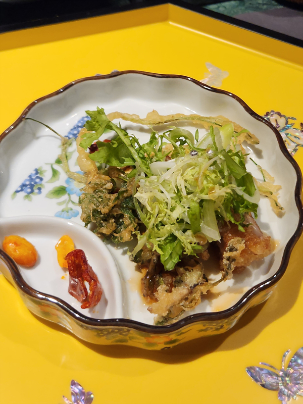다음 메뉴도 정말 아름답죠? 이름처럼 봄바람이 느껴지는 플레이팅입니다. 유림계는 일반적인 유린기라고 보시면 됩니다. 위에 나물 튀김 같은 게 올라가서 향긋하고 맛있었어요.
