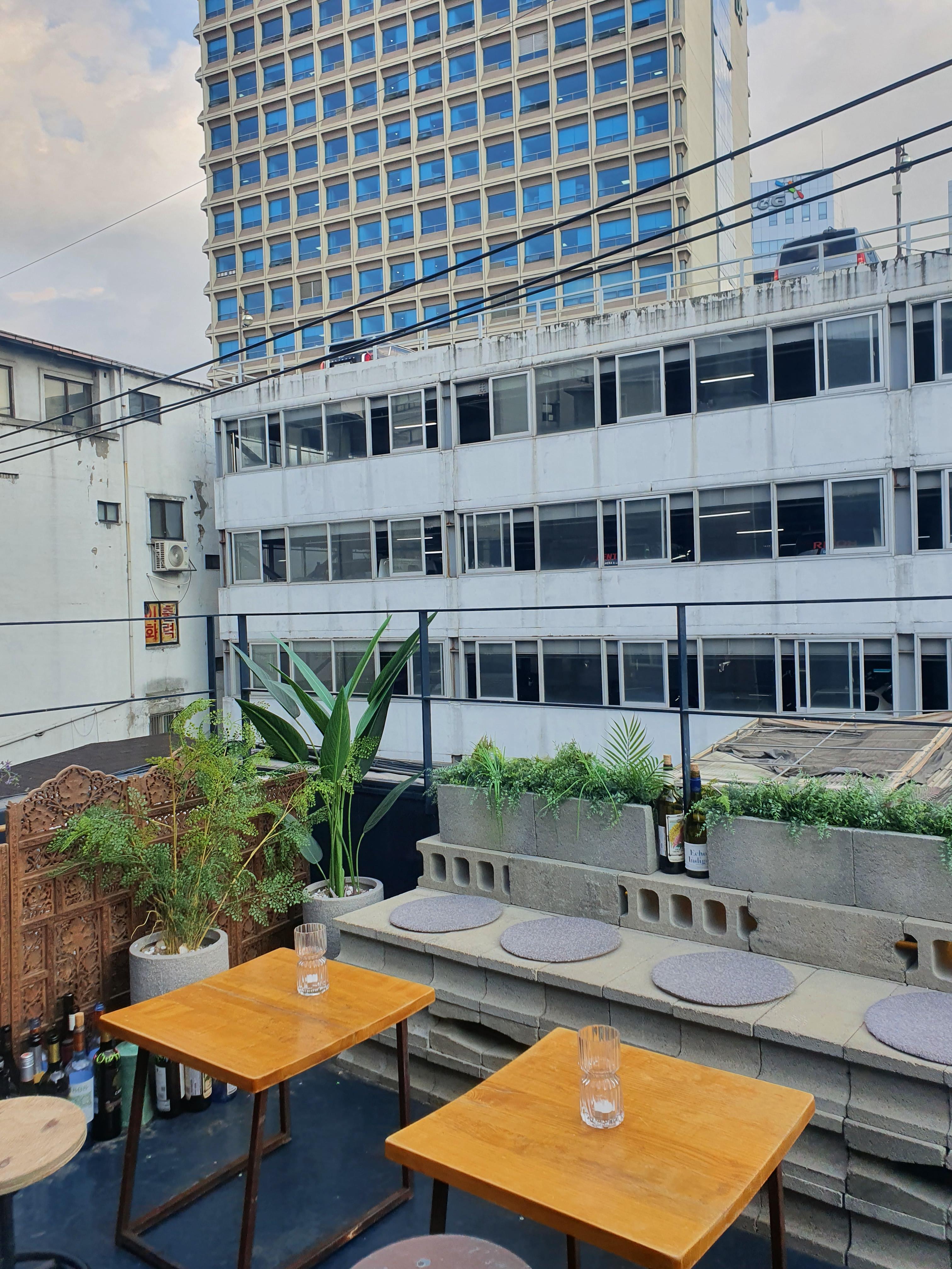 선선하게 바람이 부는 봄, 가을에 가면 딱 좋을 루프탑 와인바입니다. 을지로 골목 안 4층 건물 옥상에 위치해 주변 건물 들에 둘러싸여 있어서 독특한 분위기를 내는 곳이에요. 페인트가 다 벗겨진 허름한 건물과 반짝이는 고층 건물, 손을 뻗으면 닿을 듯한 전봇대가 어우러져 묘한 분위기를 만들어내는데, 마치 홍콩 어느 거리에 와 있는 기분이 듭니다.