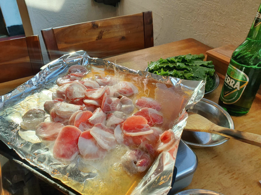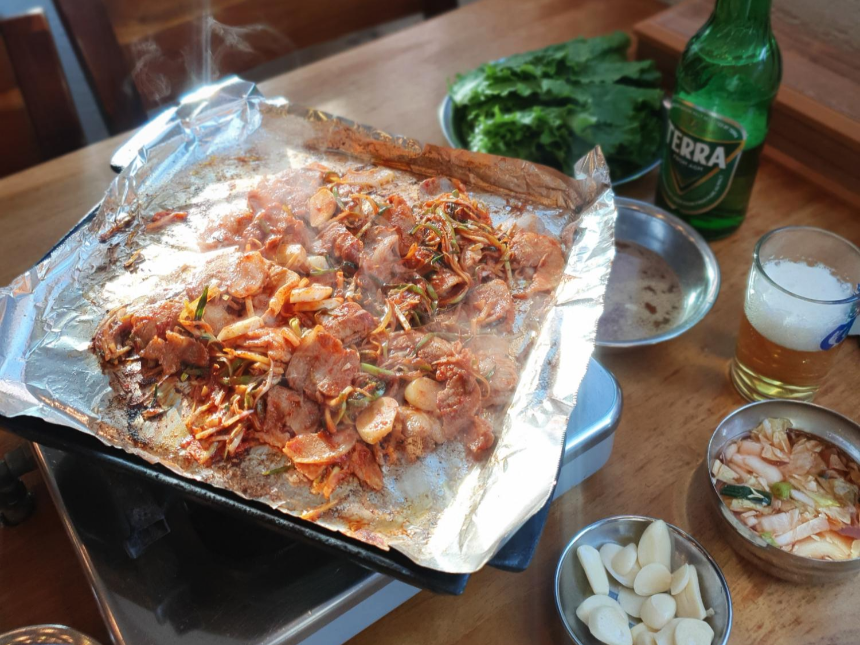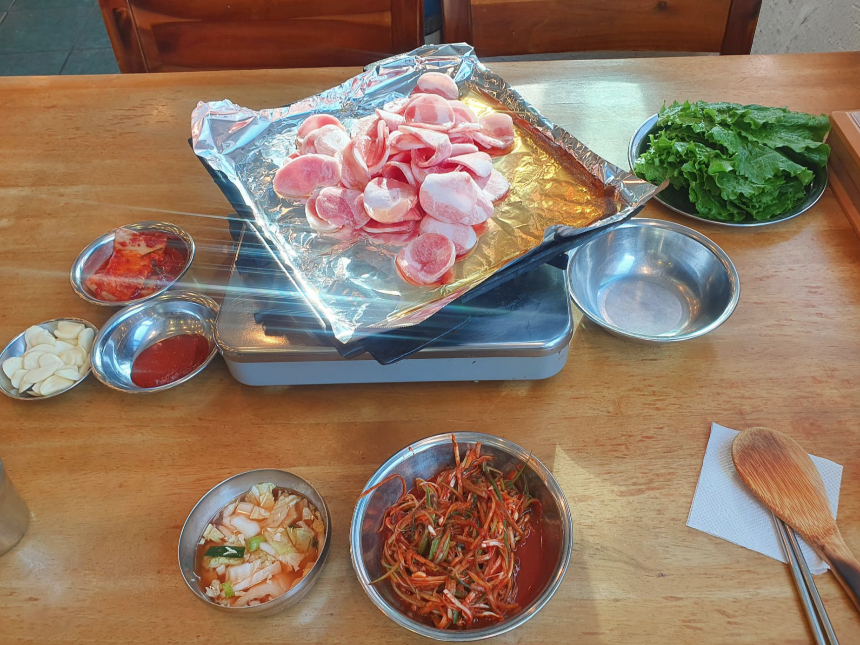 평범한 듯 독특한 비주얼의 한상차림. 삼겹살이 동글동글하네요.