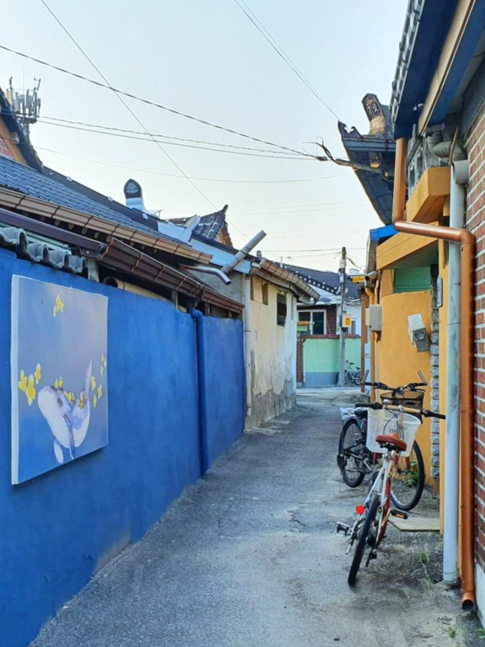 광한루원 서문에서 길 하나를 건너면 골목을 따라 벽화 거리가 시작됩니다. 한적한 골목 사이를 걷다 보면 예쁜 한옥과 조형물들도 발견할 수 있습니다. 담이 낮아서 더 아기자기한 느낌이 드는 곳입니다. 아주 넓지는 않아서 가볍게 산책하기 좋습니다.
