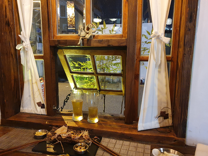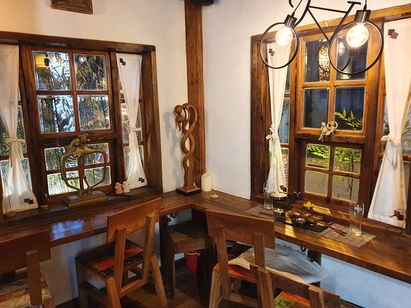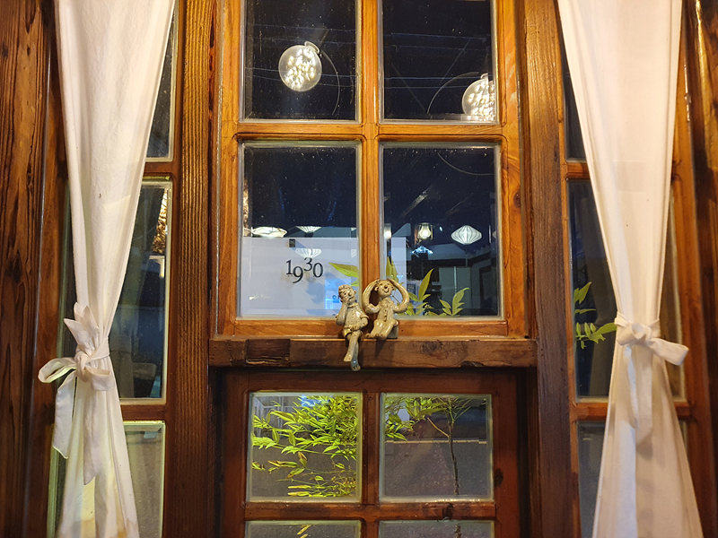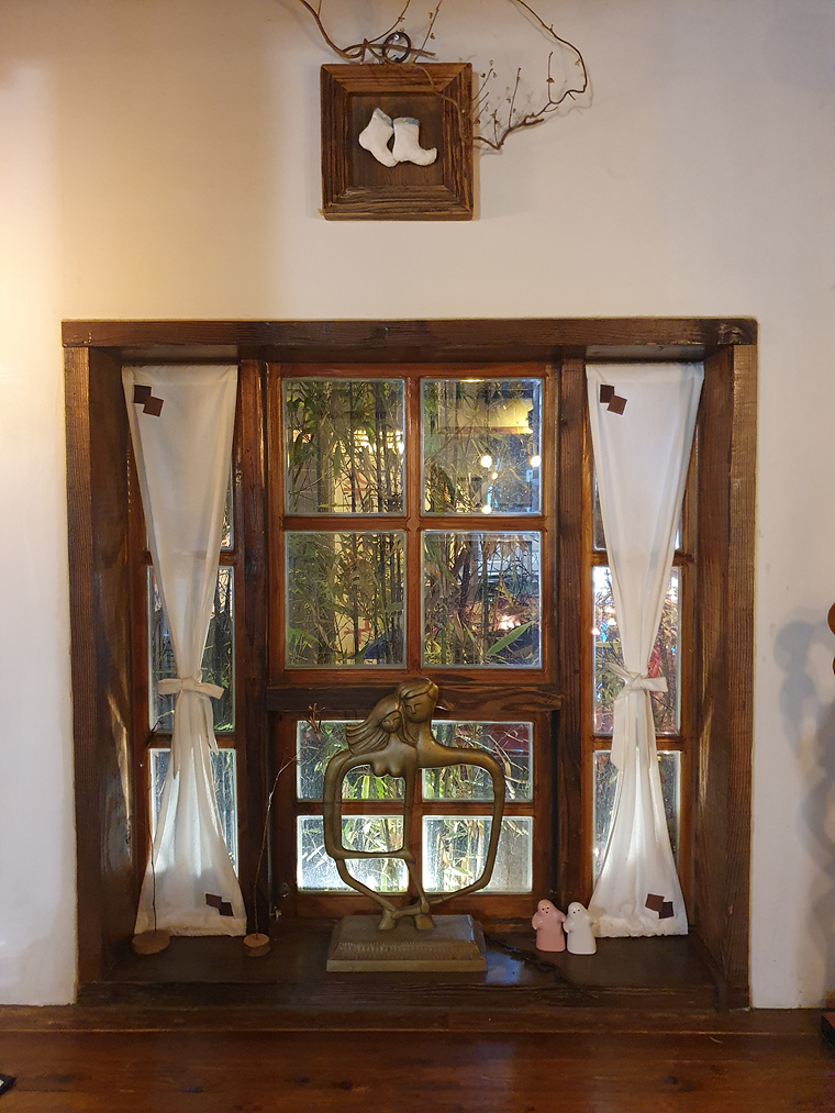나무가 주는 따뜻한 느낌에 적당히 어두운 조명, 유리창 밖에 한적한 골목길 풍경이 만나 몽환적인 분위기를 만들어 줬어요.
