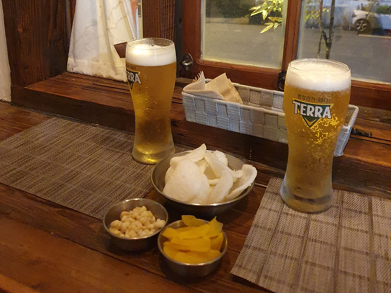 먼저 맥주와 기본 안주로 새우칩, 콘샐러드, 단무지가 나왔어요.