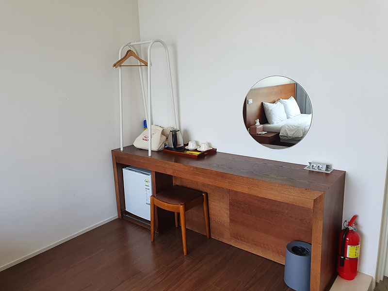 옷장은 없고 작은 옷걸이가 있습니다. 참고로 가운은 제공되지 않고 체크인 데스크에서 1벌당 5천 원에 대여 가능합니다.