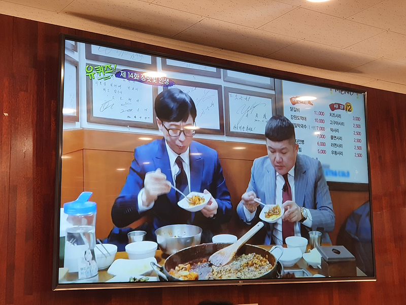 매장 내부에는 유퀴즈 에 나온 오근내 닭갈비 영상이 틀어져 있었어요.