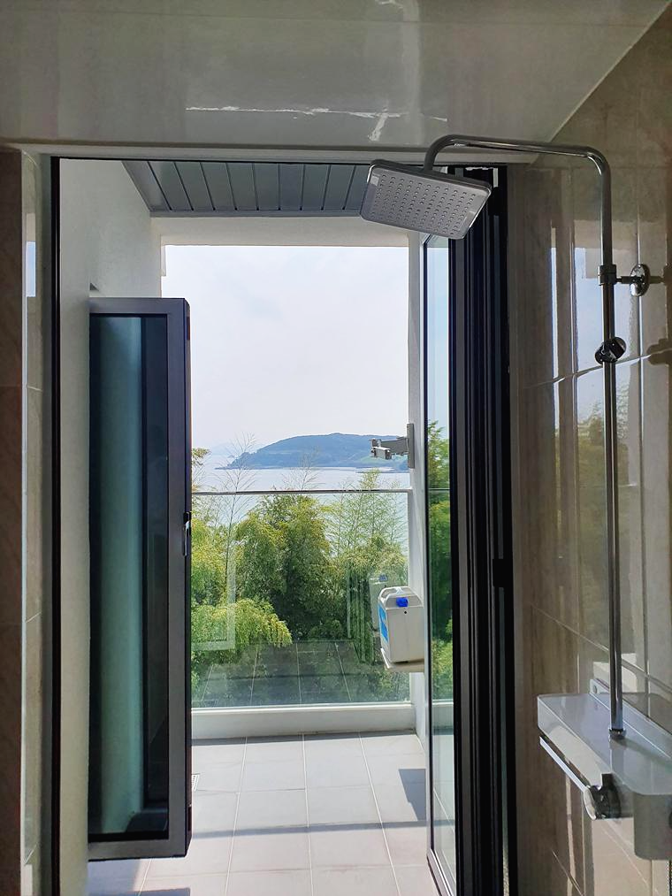 욕실에서는 이렇게 발코니 쪽 문을 열고 열고 바다를 보며 샤워할 수 있답니다.