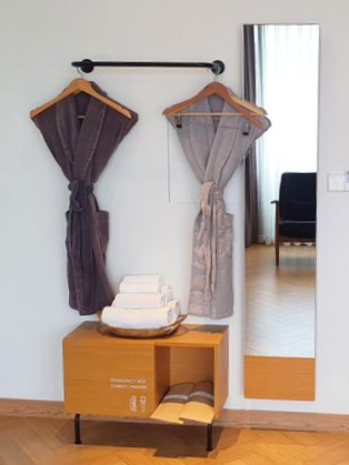 옷장 대신에 옷걸이에 가운 두 개가 걸려 있습니다.