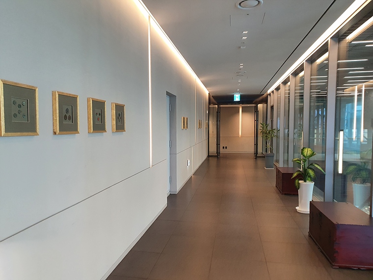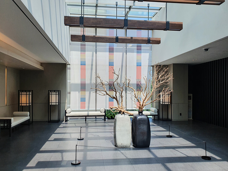 로비 중앙은 천장이 높고 유리로 되어있어 개방감이 좋았어요. 창가에 설치된 은은한 색감의 블라인드에 햇살이 닿으니 더욱 고급스러운 분위기가 만들어 집니다.