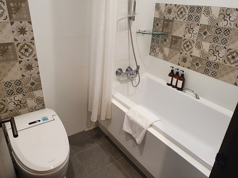 욕조를 좋아하지만 샤워할 때는 분리된 샤워부스를 선호하는 편이라 개인적으로는 아쉬웠습니다. 욕조에 있는 샤워 커튼은.. 아무리 청소를 해도 습기를 품을 수밖에 없을 듯하여 좋아하지 않거든요.