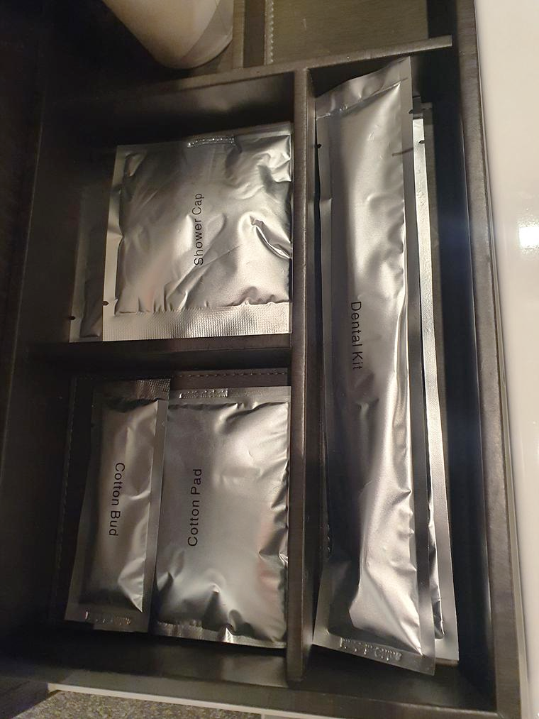 세면대 왼쪽에 칫솔 등이 준비되어 있고 아래쪽에 수건, 드라이기가 있습니다.